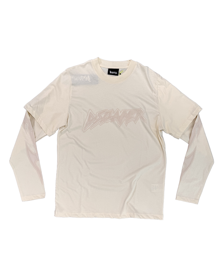 T-shirt con doppia manica beige con logo 3D frontale e grafica tribale sulle maniche.