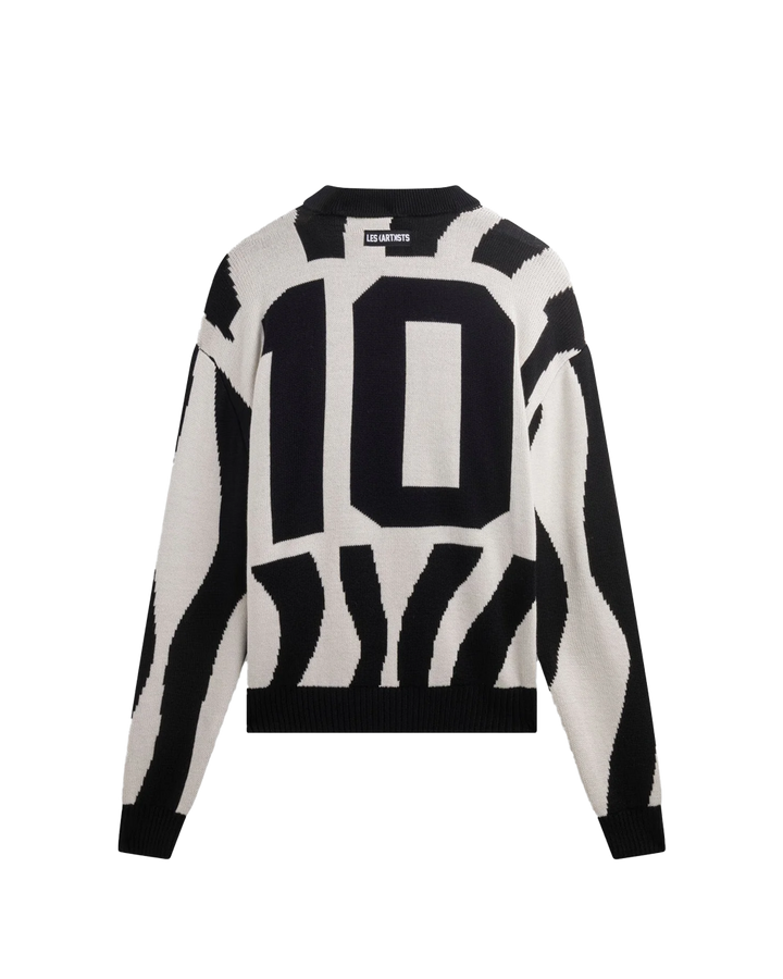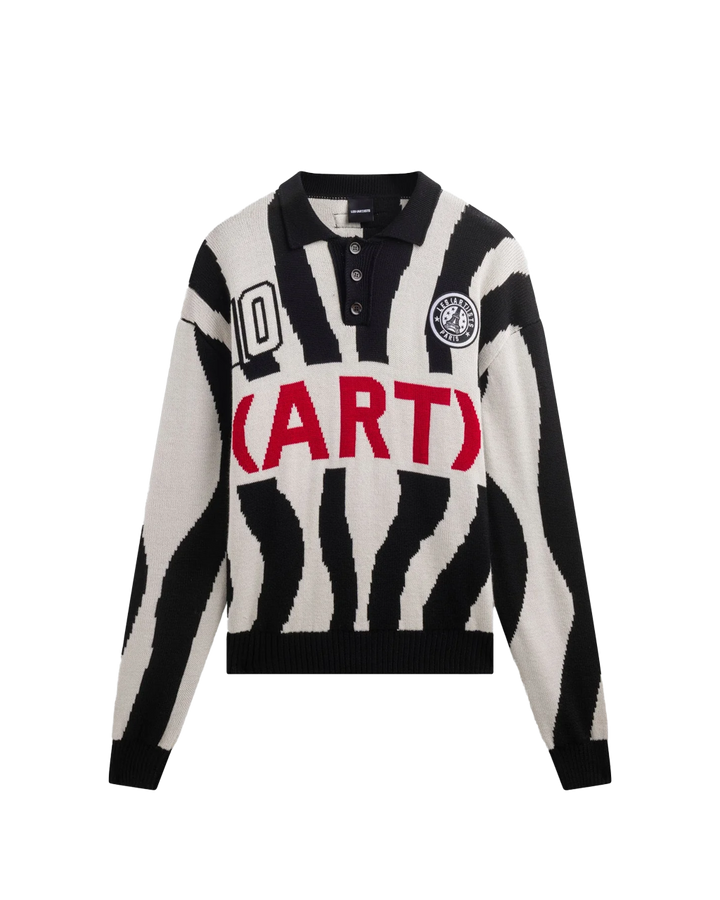 È un'audace reinterpretazione dell'estetica ispirata al calcio. Caratterizzato da una maglia jacquard effetto zebra, il design è elevato con dettagli distintivi come il logo (ART) e il numero 10. Realizzato con una miscela calda ma traspirante, questo pezzo di maglieria è ideale per fare una dichiarazione forte.