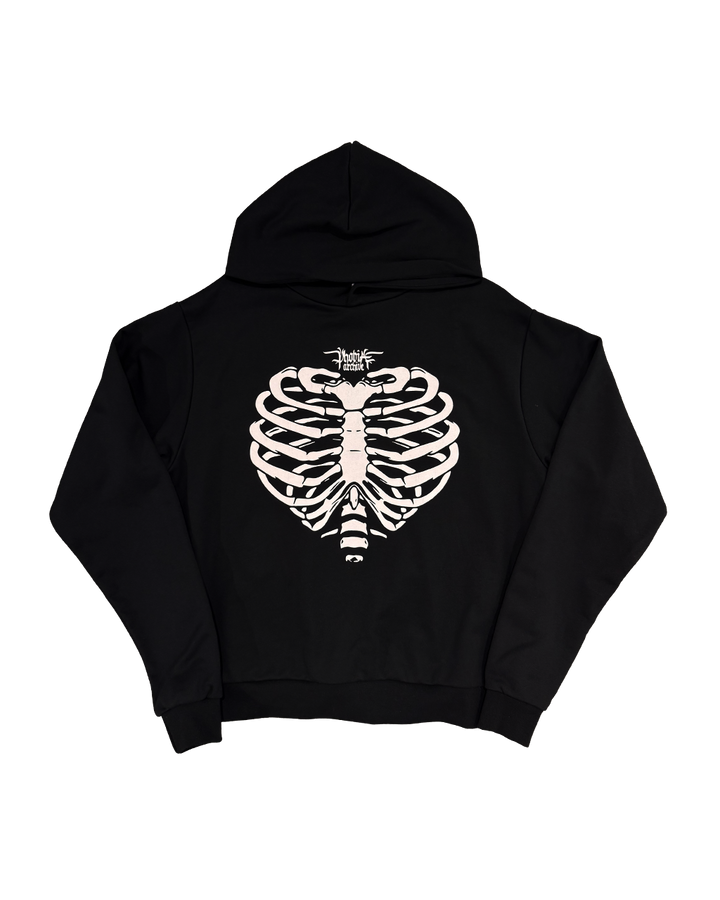 Felpa con cappuccio nera con stampa frontale bianca, cuore gabbia toracica.