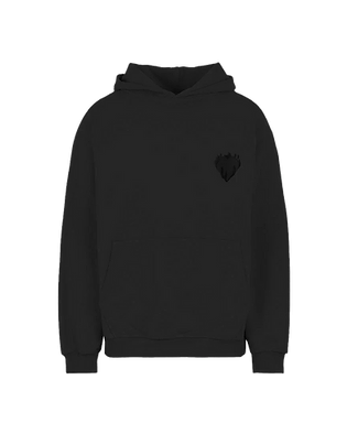 Felpa con cappuccio nera con cuore fiammeggiante ricamato tono su tono.