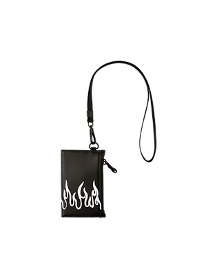Porta carte con design fiamme bianche. 4 scompartimenti per le carte più tasca con cerniera . Cordone per appenderlo al collo rimovibile.