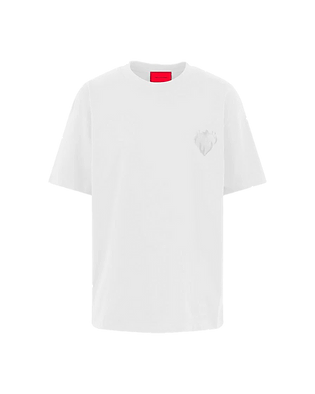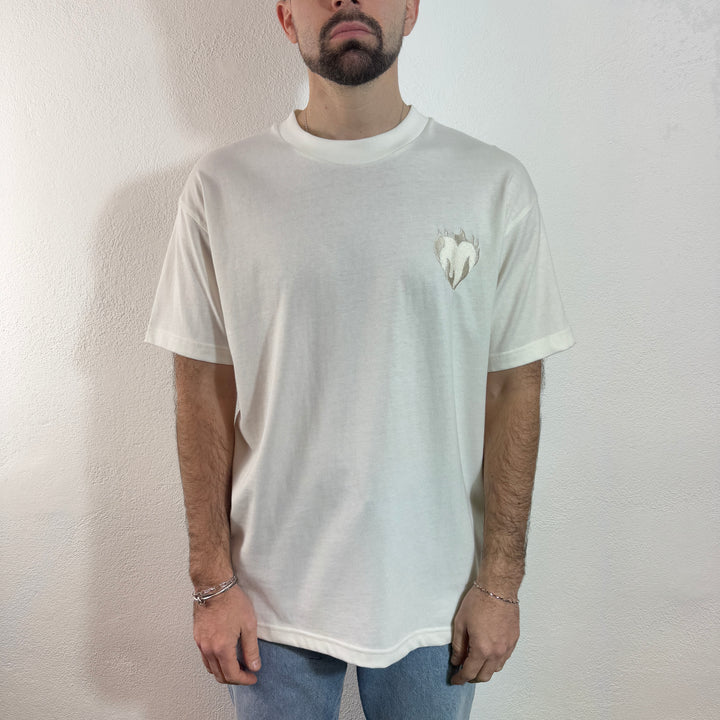 Tshirt bianca con cuore fiammeggiante ricamato tono su tono.