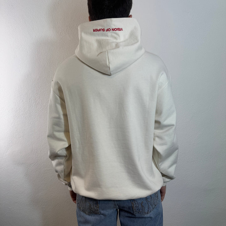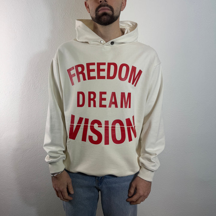 Felpa bianca con cappuccio con una vivace stampa freedom sul davanti e un'elegante etichetta in metallo.