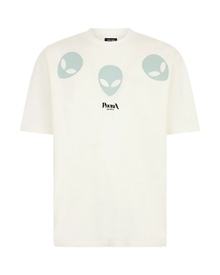T-shirt bianca con grafica Triple Alien in stampa serigrafica fosforescente e logo puffy nero