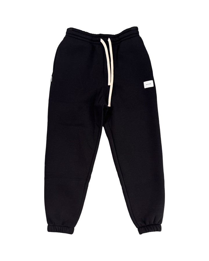 Pantalone in cotone con molla in vita e alle caviglie, due tasche frontali con patch logo.