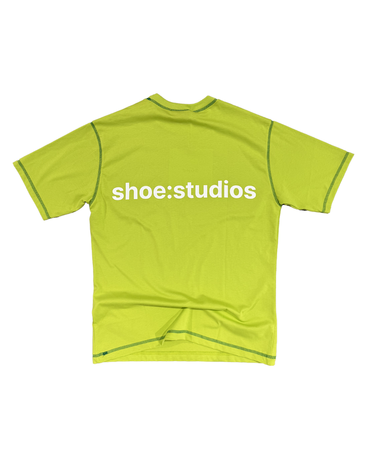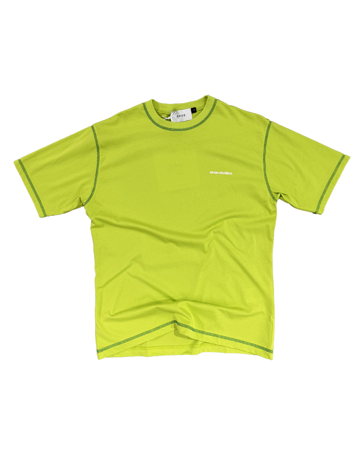 T-shirt verde lime con stampa frontale e sul retro e cuciture bianche a contrasto.