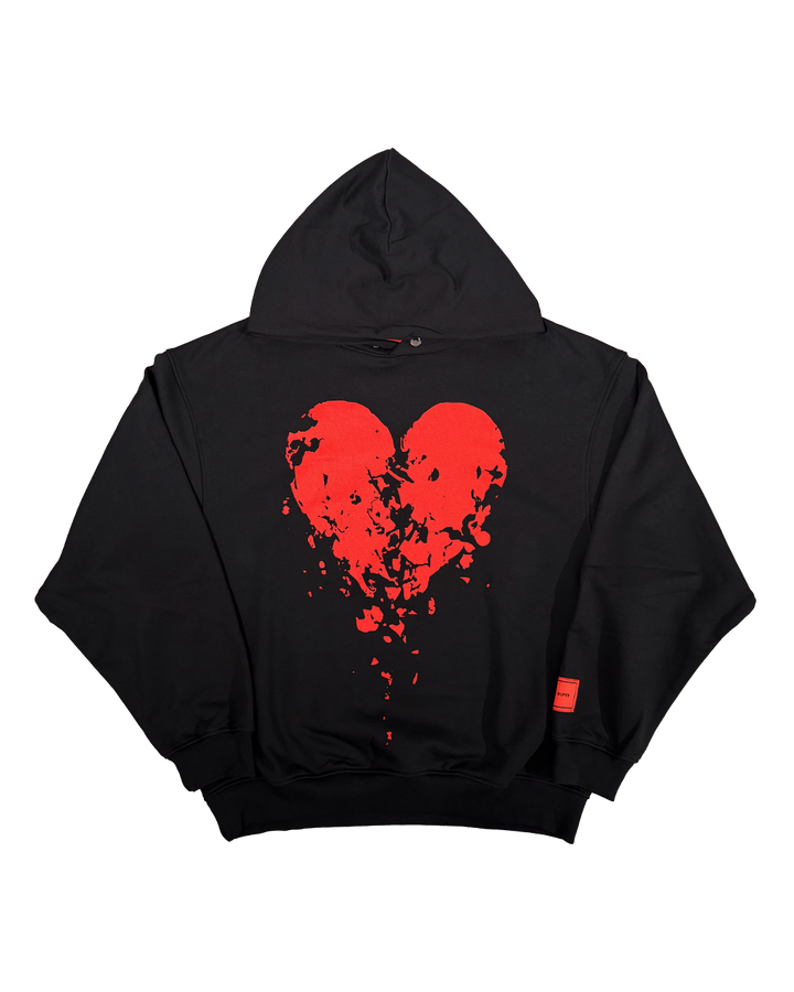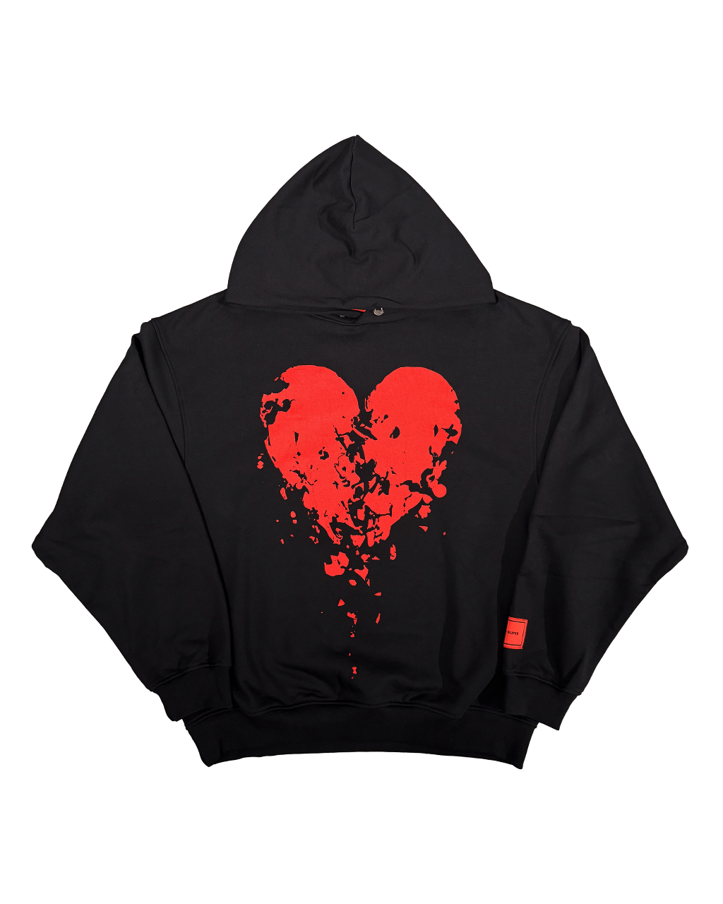 Felpa con cappuccio nera con grafica cuore spezzato e etichetta. rossa sulla manica