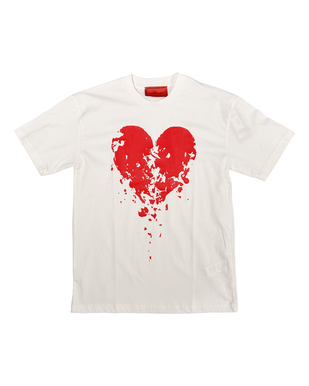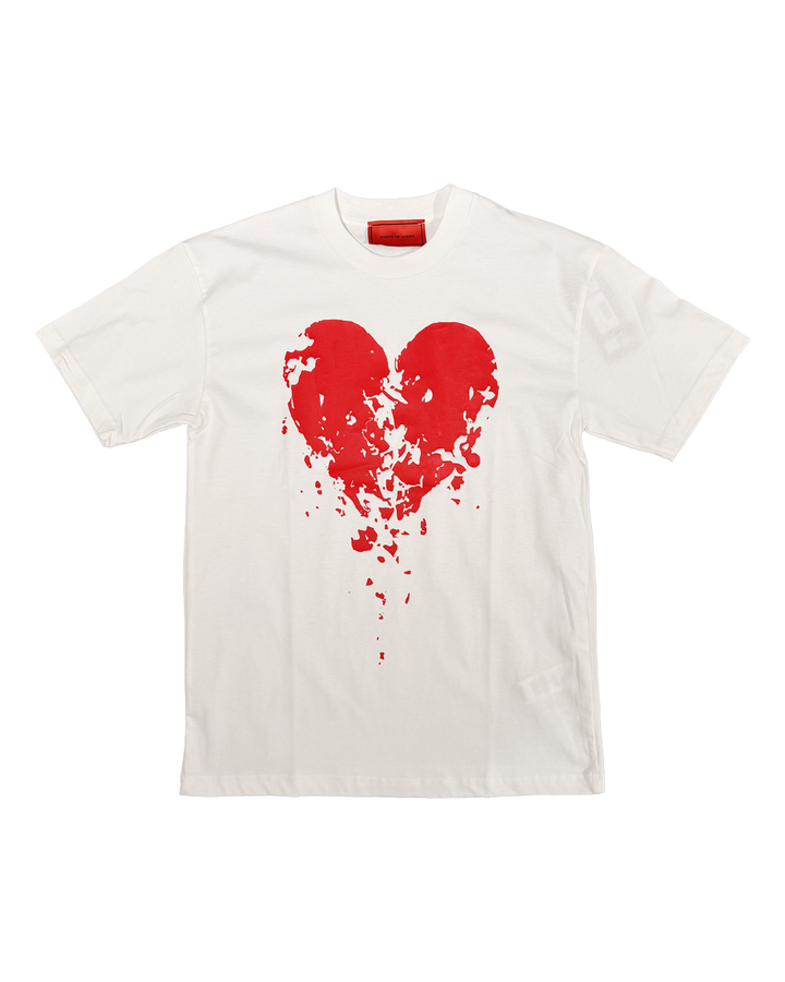 T-shirt bianca con grafica cuore spezzato e etichetta rossa sul retro.
