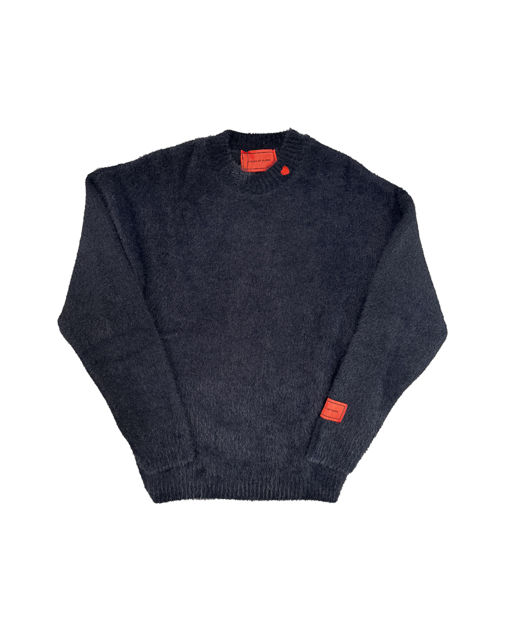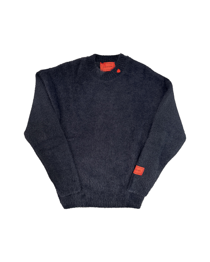 Maglione con filato "peloso" nero con mini cuore sul collo e patch.