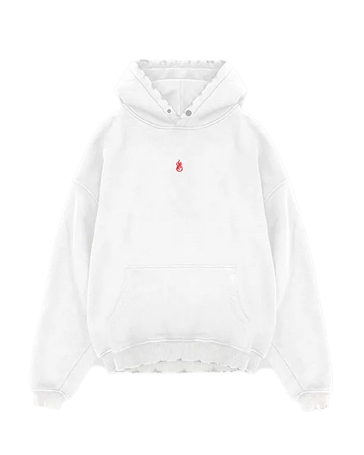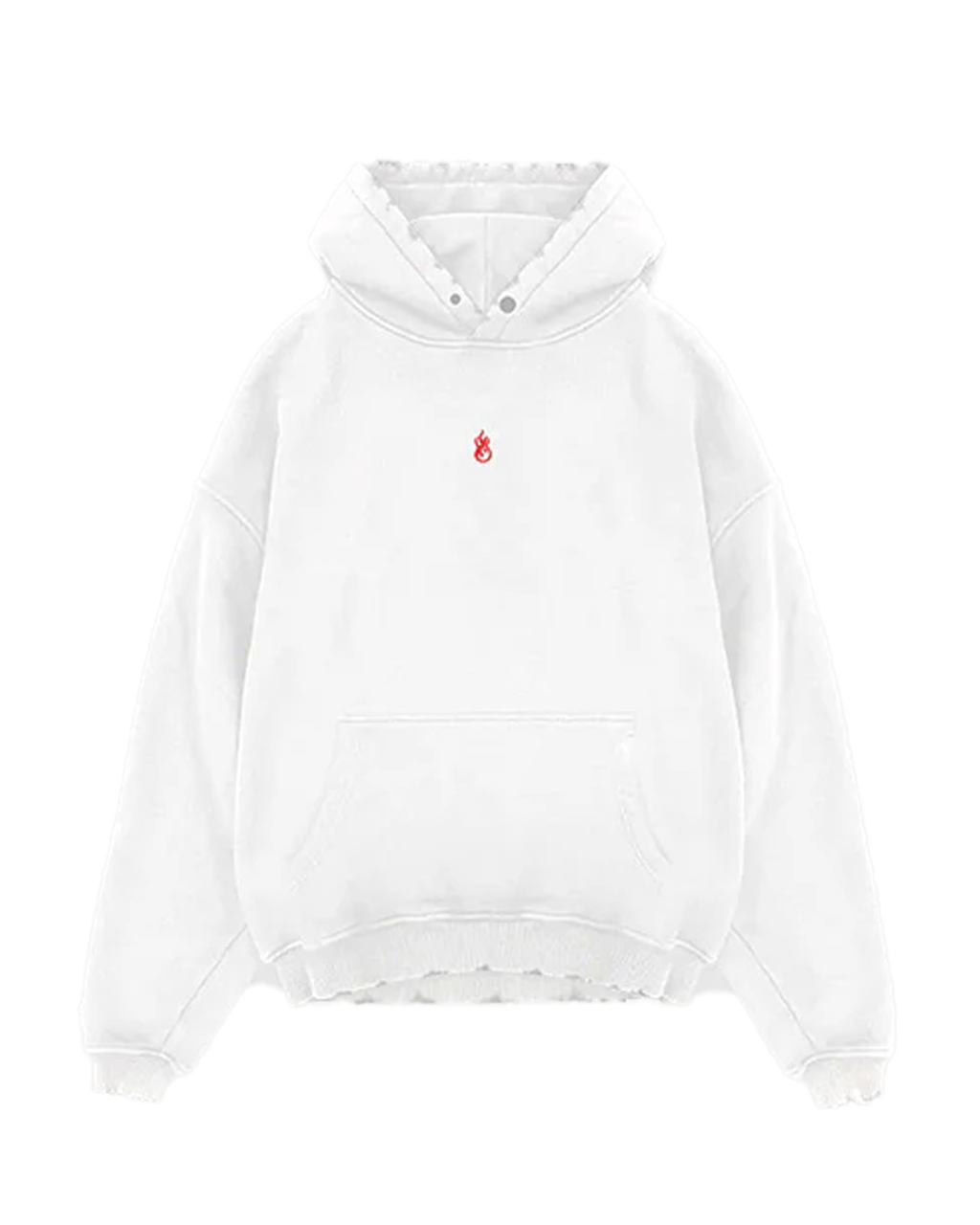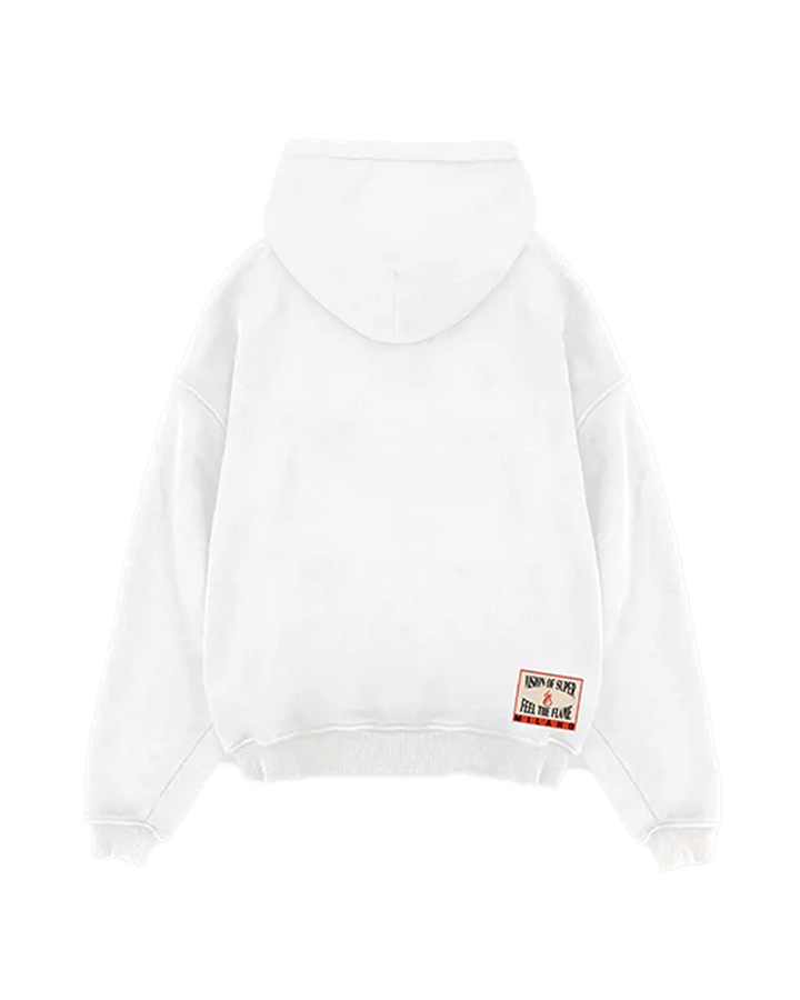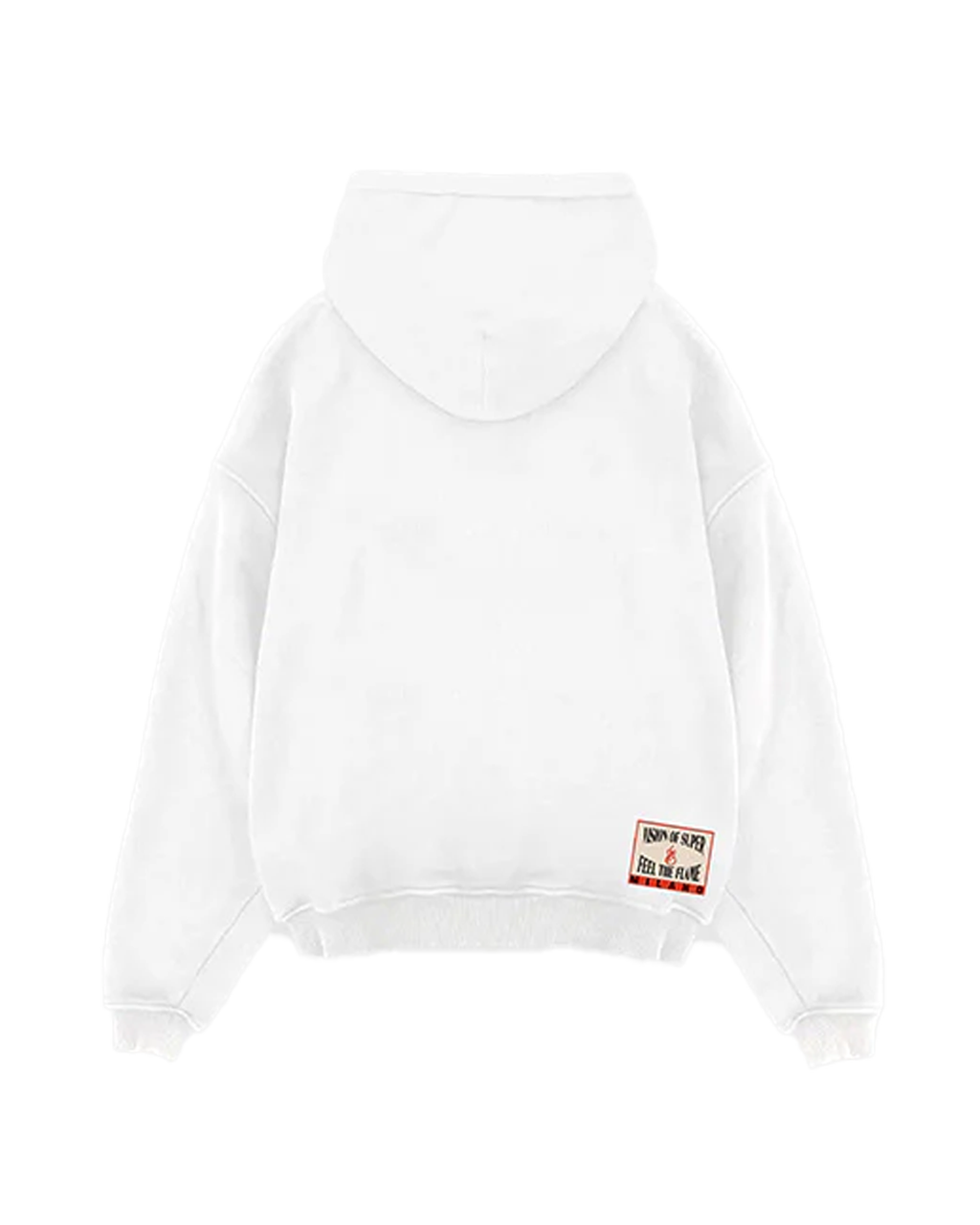 Felpa bianca con cappuccio con fiamma ricamata e etichetta sul retro.