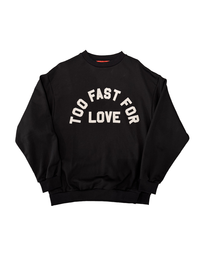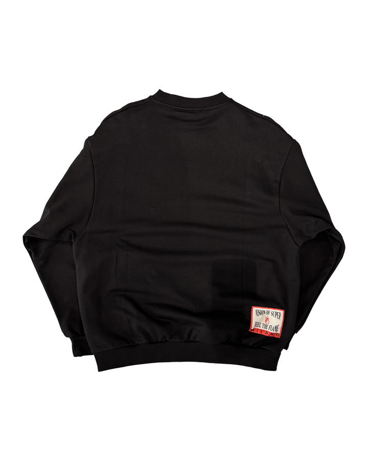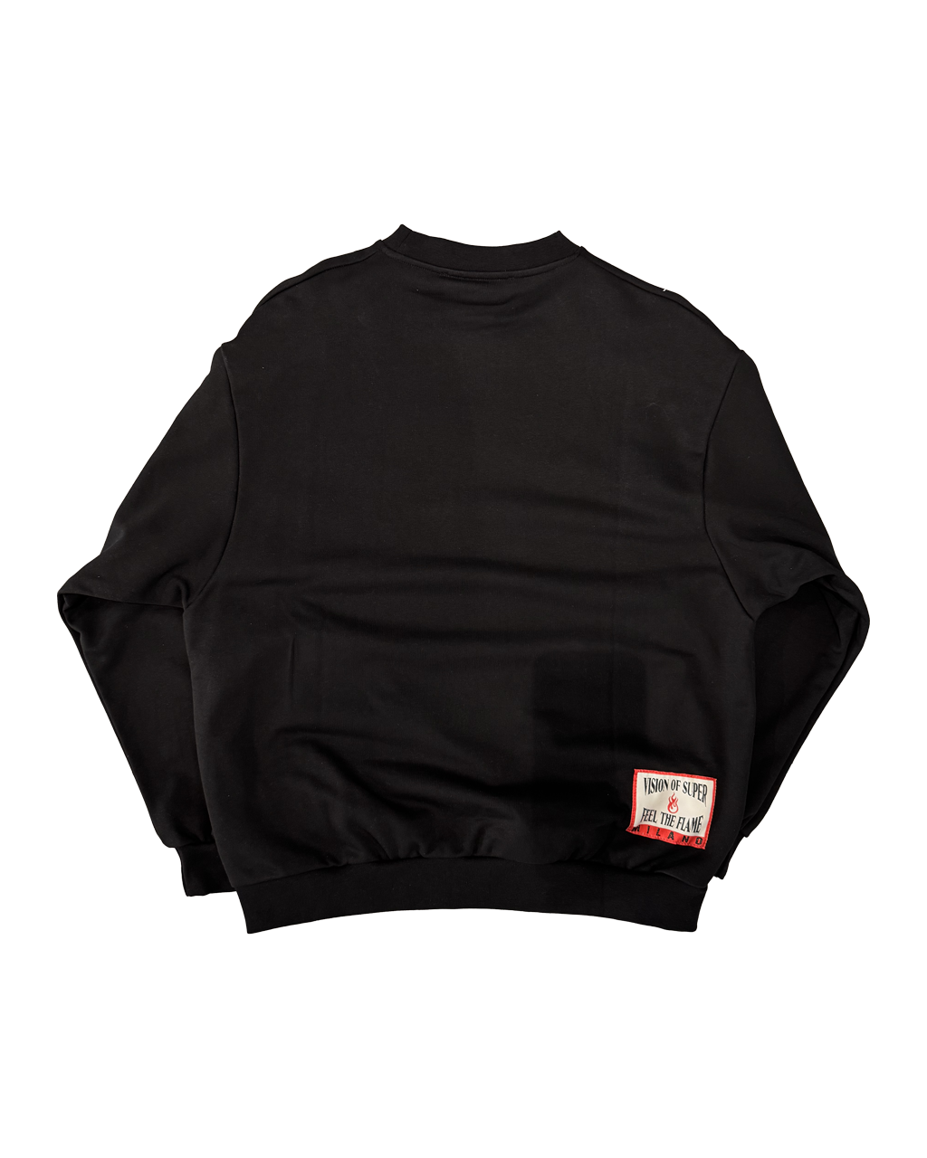 Felpa nera senza cappuccio con scritta frontale cucita e etichetta sul retro.
